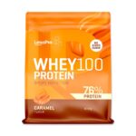 LinusPro Whey100 med karamelsmag byder på 76 % protein og en fyldig, sødlig smag uden tilsat sukker. Ideel som shake efter træning, eller som ingrediens i sunde snacks.