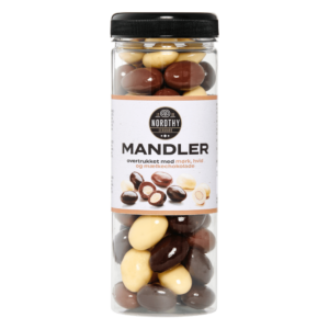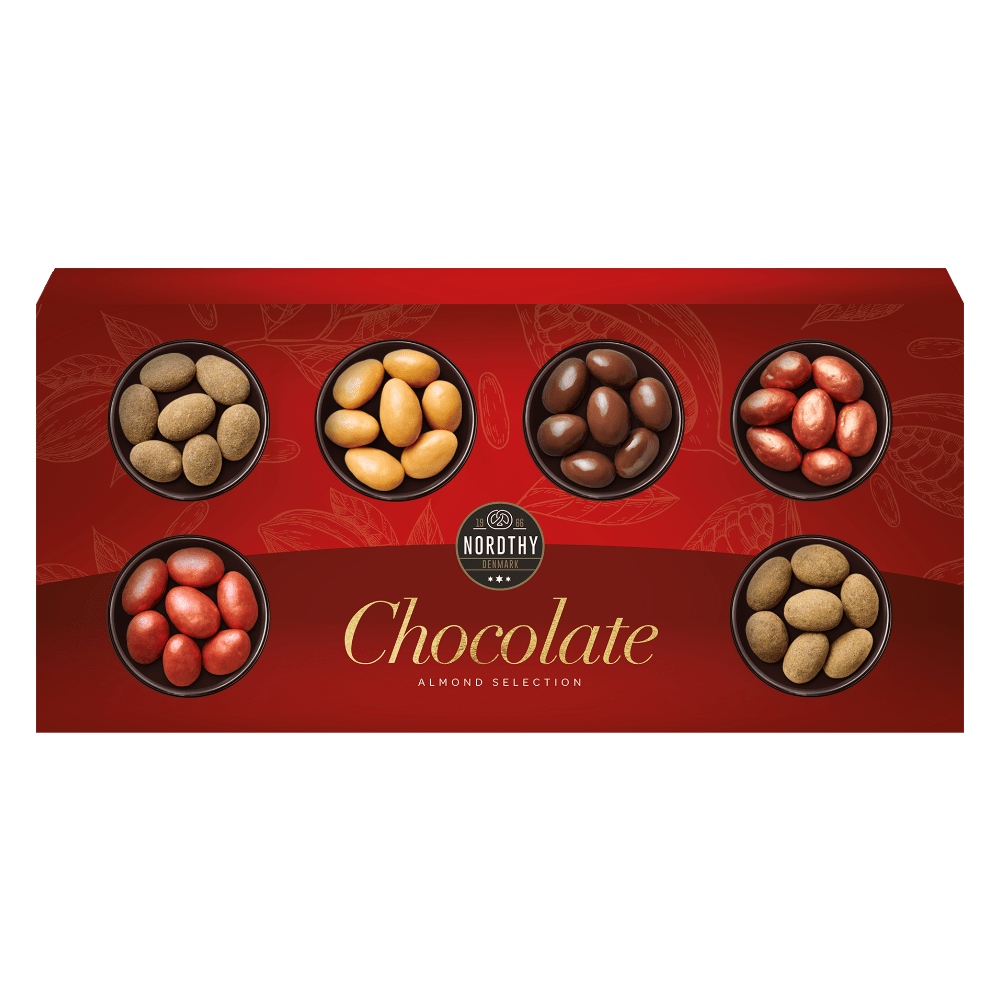 Nordthy Mini Gaveæske med Chokolade Mandler. Mandler overtrukket med hvid, mørk og mælkechokoade og dragé/pulver.. 6 Lækre og udvalgte smagsvarianter.