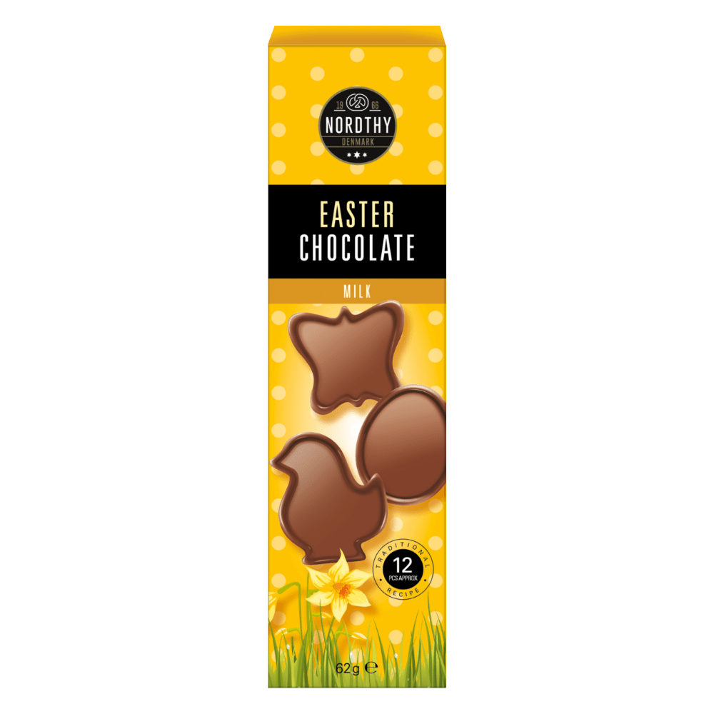 Nordthy Easter Chocolate, også kaldet påskechokolade, er en æske med ca. 12 stk. mælkechokolader, der er formet som fine påskemotiver.