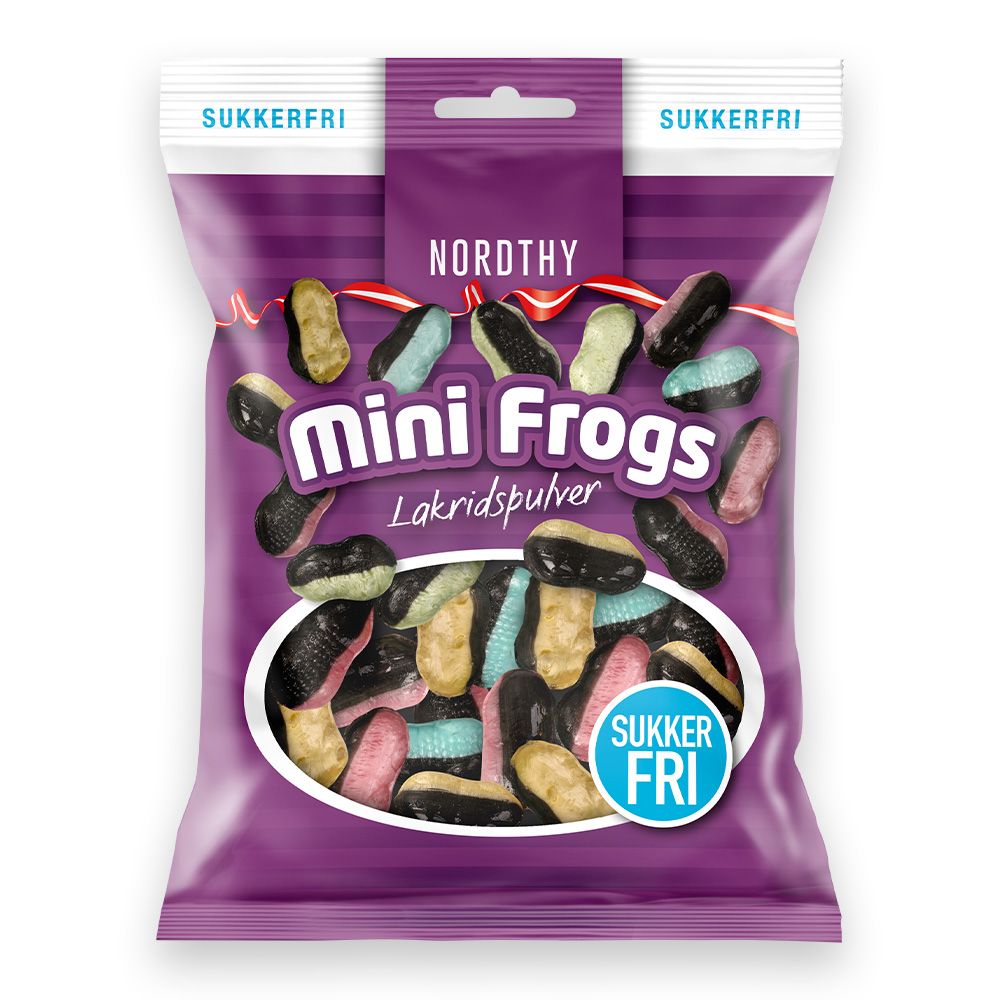 Nordthy Sukkerfrie Mini Frogs er en bolcheblanding af sukkerfrie bolcher med pulverfyld, der er formet som små frøer.